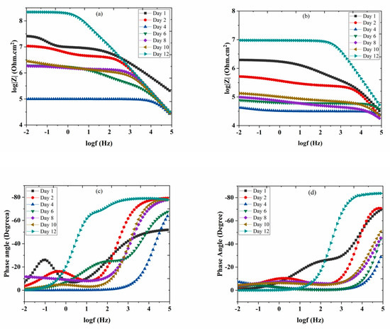Corrosion resistance behavior of nanocomposite coatings deposited on carbon steel was studied by EIS measurements. The coated samples were immersed in 3.5 wt.% NaCl solution at pH values of 2 and 5. Corrosion resistance of the coated samples was studied up to 12 days of immersion. Figure 8a,b shows the bode plots of nanocomposite coatings at pH 2 and 5. Phase angles measured at pH 2 and pH 5 are also shown in Figure 8c,d. Table 1 shows the electrochemical impedance parameters obtained from EIS analysis at pH 2 and pH 5. The equivalent circuit used for fitting of EIS data is also shown in Figure 8e. At pH 2, the charge transfer resistance (Rct) after one day of immersion for nanocomposite coatings is measured to be as 16.54 × 106 Ω.cm2 with a lower value of phase angle. Higher Rct value shows that at the beginning nanocomposite coatings are able to protect themselves from corrosion attack. However, this value dropped down to 136.2 × 103 Ω.cm2 after four days of immersion in the solution indicating that the coatings have started losing their ability to resist the corrosive attack. At the later days of immersion, the Rct value again shows an increase by reaching a maximum value of 148.2 × 106 Ω.cm2 with a major shift in the value of the phase angle (after 12 days of immersion). This increase in the Rct value after four days, is due to the release of the DOC from the loaded nanotubes, which is forming a protective film in the scratched area, hence mitigating the corrosion phenomenon in that region. A schematic diagram showing the coatings healing mechanism is shown in Figure 9. The release of DOC from TNTs and the formation of a protective layer of DOC to inhibit corrosion attack is presented to explain the inhibition process.