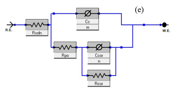Bode graph of TNTs loaded with DOC (a), 5 wt.% at pH 2 (b), 5 wt.% at pH 5, phase angle measured of TNTs loaded with DOC (c), 5 wt.% at pH 2 (d), 5 wt.% at pH 5 (e); equivalent circuit used for fitting of EIS data.