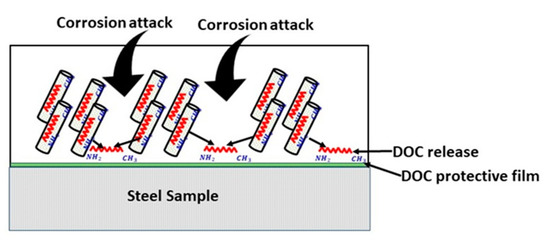 The synthesized TiO2 nanotubes (TNTs) were loaded with the corrosion inhibitor, dodecylamine (DOC), following the procedure adopted by Price et al. [37]. Then, 300 mg of synthesized TNTs were to be mixed into a DOC solution 25.0 mg/ml in ethanol. After sonication, the solution was kept inside the vacuum jar for 24 h to complete the loading process; during the loading process, the air trapped in the nanotubes was replaced with DOC. A proposed schematic illustration of this encapsulation process is presented in Figure 1.