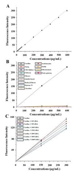 Furthermore, curdlan was used as the 1,3-β-glucan standard to build a calibration curve. The binding specificity of the fluorescent dye (aniline blue) to 1,3-β-glucans was examined by comparing the aniline-blue-induced fluorescence intensities among pectin, CM-cellulose, chitosan, glucose, soluble starch, barley β-glucan, dextran, arabinoxylan, inulin, glucomannan, pectic galactan, and fucoidan at the concentration of 300 µg/mL and 600 µg/mL, respectively. Additionally, the effect of simulative protein on the fluorometric assay was tested by adding 150 µL of BSA at 10%, 50%, 100%, 150%, 200%, 500%, and 1000% (w/w) of curdlan concentrations into 150 µL of 300 or 600 µg/mL curdlan solutions.