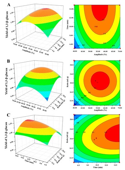 Three-dimensional response surface (left) and two-dimensional contour (right) plots showing the interaction effects on the extraction yield of water soluble 1,3-β-glucans: (A) ultrasound amplitude and ultrasound extraction time; (B) ultrasound amplitude and ratio of water to raw material; and (C) ultrasound extraction time and ratio of water to raw material.