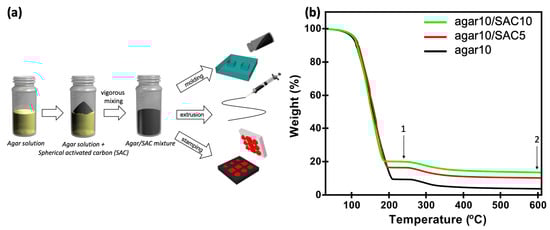 (a) Schematic diagram showing the preparation of the shape-configurable agarose and spherical activated carbon (agar/SAC) composite gels through various processes. (b) Thermogravimetric analysis (TGA) of the 10 wt % agarose gel as a control (agar10, black), 10 wt % agarose containing 5 wt % spherical activated carbon (agar10/SAC5, red), and 10 wt % agarose containing 10 wt % SAC (agar10/SAC10, green). Gels were fully dried near 230 °C (point 1), and agar was fully decomposed near 600 °C (point 2).