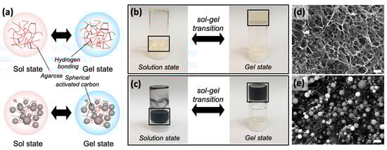 The agar/SAC composite gels underwent a reversible sol–gel transition upon heating/cooling, which was crucial for developing shape-configurable electrode materials. Agar could be physically crosslinked below the melting temperature as repeating units were bonded through hydrogen bonds [], as illustrated in Figure 2a. The agar solution and agar/SAC mixture showed the same reversible sol–gel transition behaviors at 90 °C, Figure 2b,c, with slightly different mechanical strengths. Whereas the pure agar gel formed a fine polymer network, the agar/SAC composite gels formed rather sparse networks, as shown in Figure 2d,e. The network differences were attributed to the high volume-to-weight ratio of the SAC microspheres, which occupied a significant volume of the composite gels and interrupted the hydrogen bonds among the agar polymers.