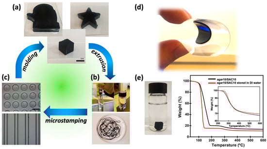 The structural integrity of the agar/SAC composite gel is of great interest for designing shape-configurable electrodes. Thanks to its reversible and quick gelation characteristics, agar/SAC composite gels can be prepared and recycled into various shapes using different engineering processes. We demonstrated reconfiguration of agar/SAC composite gels by repetitive gelation and melting processes, as shown in Figure 3. The shape of the agar/SAC composite gel was configurable by molding the agar/SAC mixture and allowing gelation at room temperature. We formed cubic, star-shaped, and mitten-shaped agar/SAC composite gels to demonstrate the shape configurability, as shown in Figure 3a. The quick gelation characteristics also enabled the continuous production of fibrous composite gels by extrusion of the agar/SAC mixture through a syringe. As the molten agar/SAC mixture at 90 °C was injected into the water at room temperature, gelation took placed within a few seconds, resulting in fibrous agar/SAC composite gels, Figure 3b. The dimensions and mechanical properties of the fibrous agar/SAC composite gels were controlled simply by the inner diameter of the syringe needle and the agar composition, respectively, which enabled the production of textiles or 3D-printed electrodes. Hierarchically designed gel electrodes were prepared using microstamping. Line and dot array micromolds composed of poly(ethylene glycol) diacrylate were stamped using the agar/SAC composite gels, Figure 3c. Here, the hydrophilic master mold was selected to avoid the condensation of vapors generated from the hot molten agar/SAC mixture onto the master (see the Supporting Information Figure S2 for details). Micropatterning is potentially important for the design of gel-type electrodes with a structural hierarchy. Specifically, micron-scale patterned composite gels could provide synergetic effects with the porous SAC, thereby improving the contact area between the electrode and the electrolyte and increasing the efficiency of electron transfer in an energy device [,]. Finally, we prepared a film-type agar/SAC composite gel on a flexible substrate. The film was readily bent, even with compressive bending of the substrate, without deteriorating the structures, Figure 3d.