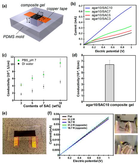 The electrical properties of the agar/SAC composite gels were investigated by varying the gel composition. We prepared identical composite gels having cube shapes of 1 cm3 using a PDMS mold, and they were connected to a copper tape, as illustrated in Figure 4a. Based on 10 wt % agar gel, the SAC content was varied from 3 to 10 wt % for the I–V measurements. The amount of SAC in the agar matrix was determined by considering the processability of the materials. When the amount of SAC was less than 3 wt %, the pre-gel mixture was too viscous for successful molding or extrusion, which is not preferred in broad applications. For amounts of SAC higher than 10 wt %, final agar/SAC composite gels did not have enough strength to maintain their shapes due to weak hydrogel bonding among agar polymers. The electrical properties increased as the SAC content increased, as shown in Figure 4b. The conductivity of each composite gel was calculated using the slope of the I–V curves, resulting in 1.73 × 10−4 S/cm for the 3 wt % SAC and 5.11 × 10−4 S/cm for the 10 wt % SAC composite gels. We found that the conductivity increase was not linearly proportional to the amount of SAC. Although the agar matrix has good ion transport capabilities, controlling the distance between SACs as closely as possible is crucial for the electrical properties. We think that the sample with 10 wt % SAC has enough packing density for electron transport, and the high packing density of SAC can be confirmed in Figure 2e. Such issues can be addressed by adding smaller sized conducting agents such as super p as an additive, which can fill the interstices between SACs [].