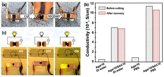 Agar/SAC electrodes are suitable for use in devices that require repeated mechanical deformation. The elastic property of the material enables repetitive stretching or bending, and the material softness enables conformal contact between the broken gels in the event that sudden mechanical damage disconnects the electrodes. The electrical properties of the agar/SAC composite gels were easily recovered due to the good deformability of the material. We measured the conductivity change of the agar/SAC composite gel before and after cutting, and compared it with that of the control samples as shown in Figure 5a. The results shown in Figure 5b revealed that the conductivity decreased by 5–7% in the recovered sample compared to the original without further treatment. Recovery from mechanical damage was further tested by preparing a simple electrical circuit system connected to a green light emitting diode (LED), Figure 5c. As the circuit was connected with the agar/SAC composite gel, the green LED turned on, whereas the light turned off when the composite gel was cut with a razor blade. Subsequently, the light turned back on as the two pieces of the agar/SAC composite gel were brought into contact with one another in a position that was slightly different from the original position. The electrical properties were readily recovered without requiring delicate alignment of the pieces of the composite gels. The facile circuit recovery was attributed to the soft and deformable characteristics of the agarose matrix, as the rough sliced gel cross-section could be readily deformed, resulting in conformal contact.