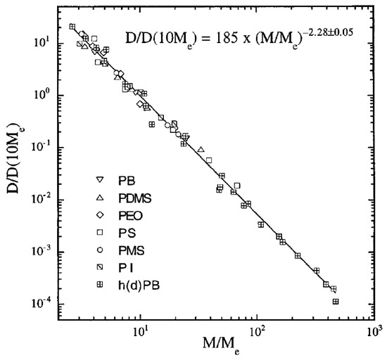 In hydrogenated poly(butadiene) (hPB) solutions and melts, it was found that (Figure 1). Although these results contradicted the widespread belief that in melts (which was observed for the PS tracer diffusion in highly entangled matrices obtained by Green et al. [42], Green and Kramer [43] and Pearson et al. [52]), it was shown that in fact the literature data for seven different polymers are consistent with scaling relation (Figure 1) [39]. Furthermore, the diffusion coefficient D of hPB/alkane solutions was also measured by forward recoil spectrometry. For samples with the data were in accordance to the scaling relation [53]. The above scaling relations and experiments were included and discussed in more detail in the review by Wang [54].