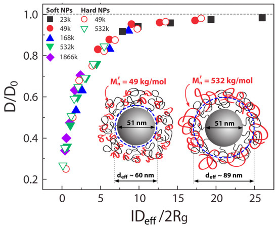 Effect of confinement parameter, defined as the interparticle distance relative to the tracer polymer size, on diffusion. The reduced diffusion coefficient of deuterated PS (dPS) with molecular weights M = 23, 49, 168, 532, and 1866 kDa as a function of the confinement parameter yields a master curve. Closed and open symbols represent dPS diffusion in nanocomposites with soft (SiO–PS87k) and hard (SiO–I) nanoparticles, respectively. [64]. Reprinted from [64] with permission from the American Chemical Society (ACS).