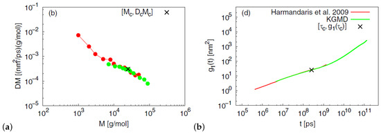 Results of mapping between multiscale MD of PS and Kremer-Grest MD (KGMD). (a) Diffusion coefficient times M versus molecular weight M, (b) mean square displacement, , of central monomers for 50 kDa PS [77]. Reprinted from [77] with permission from Springer Nature.
