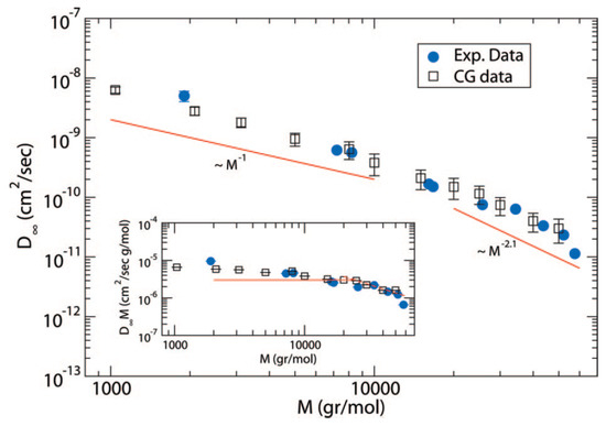 Self-diffusion coefficient of PS melts at K [93], after correcting for the chain length dependent friction coefficient, , as a function of the molecular weight. In the inset vs M is shown at K [93]. Experimental data are corrected for the different temperature ( K) with the temperature dependence reported in Reference [46]. Reprinted from [93] with permission from ACS.
