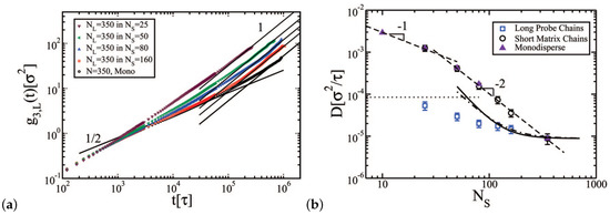 The mean square displacement and the linear diffusive regime of long polymer chains in the bidisperse melt are depicted in Figure 6a; diffusion coefficients are reported in Figure 6b. The ratio of polymer diffusion coefficient of long chains in a bidisperse sample to the diffusion coefficient of long chains in a monodisperse sample can be predicted by mesoscale simulations [110] in agreement with experiments by Wang et al. [62] for poly(butadiene) (PB) chains for volume fractions of long chains and .