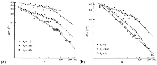 It has been shown by simulations that the semiflexibility of chains (through the insertion of a bending potential along the backbone of the polymer model) reduces polymer diffusion [111,112], since it increases the Kuhn length [113] and packing length which unavoidably decrease the entanglement length [11,114]. The polymer self-diffusivity decreases when the bending and torsion potentials increase (thus the semiflexibility increases) as can be seen in Figure 7. In addition, semiflexibility moves the transition from Rouse to reptation regimes [81,115] to longer chains. In the reptation regime the power law scaling exponent, of diffusion coefficient, becomes for the cases , or , (whereas the exponent becomes for , ) [111] in agreement with experimental [39,53], theoretical [116] and simulation predictions [117].