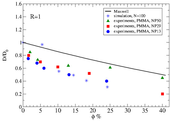An excluded volume analytical model predicts the decrease of polymer diffusion in nanocomposites, in agreement to experiments at low nanoparticle loading (lower values) [215]. However, at higher loading (low values), the model predicts a slower polymer diffusion than that observed in experiments as can be seen in Figure 17. Polymer disentanglement under high loading [15] cannot be accounted for in that analytical model, thus suggesting unknown physical mechanisms are active in that regime.