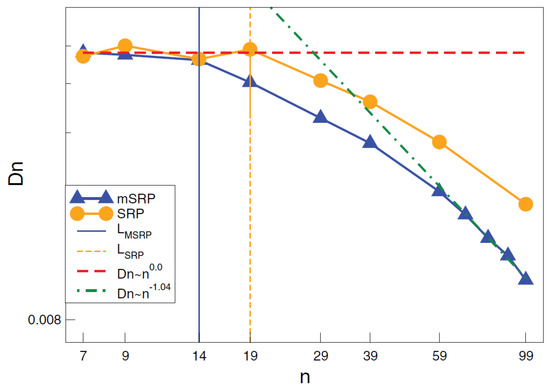 Diffusion as a function of chain length for mSRP and SRP. Rouse (dash) and reptation (dash-dot) scaling limits intersect at approximately for mSRP. The initial deviation from Rouse diffusion scaling for mSRP and SRP occurs at (solid) and (small dash), respectively. Reprinted from [161] with permission from ACS.