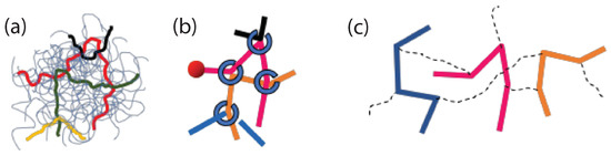 Schematics of slip-spring models. (a) Entangled chains colored in an entangled polymer melt, (b) corresponding slip-spring primitive chain network (PCN) model [178], and (c) a group of chains considered in the Doi and Takimoto (DT) model [179]. Reproduced from [183] with permission from Polymers.