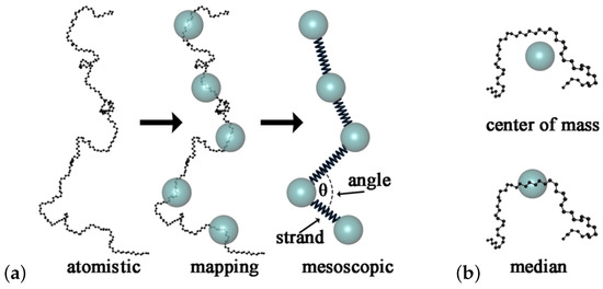 From the atomistic to the mesoscopic representation. (a) Mapping of a real polymer chain with 260 carbon atoms onto a sequence of five coarse-grained beads (). (b) Two approaches for mapping atomistic polymer segments onto beads. A bead can be assigned either to the center of mass of a segment or to the coordinates of the central atom(s) of a segment. Reprinted from [204] with permission from ACS.