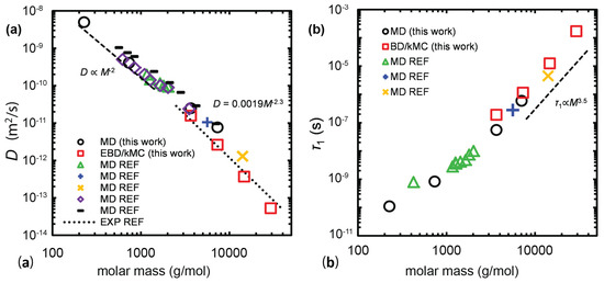 A similar effort for PE with larger number of monomers () was performed by Ramos et al. [82]. The results from simulations regarding the friction coefficient , the zero-shear rate viscosity and the self-diffusivity were in agreement with experiments [27]. Another MD study of a united atom force field for PE was applied by Takahashi et al. [83]. The scaling laws for representative polymer properties, such as diffusion, viscosity, relaxation time were compared to theoretical predictions [83] as can be seen in Figure 3. Atomistic simulations of cis-1,4-poly(butadiene) (PB) melts, in high molecular length of monomers, by implementing a united atom force field, were performed for times up to 600 ns [84]. Dynamic properties, such as segmental and terminal relaxation, self-diffusivity and the single-chain dynamic structure factor, , at atmospheric pressure in a temperature range of 298–430 K were calculated [84]. The data showed that, around monomers, D changed to a reptation-like (where ) behavior at 413 K.
