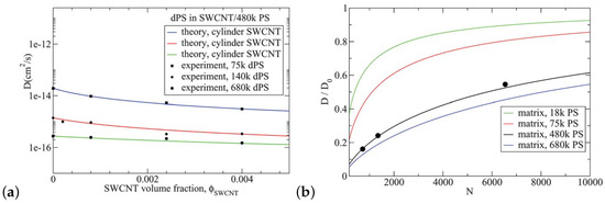 A theory based on the reptation model was developed for PS/SWCNT nanocomposites, which was modified to incorporate the effect of the surface monomer contacts. In particular, it predicted well the experimental tracer PS diffusion for low SWCNT loading below the percolation threshold as can be seen in Figure 16. In addition, the theory could predict the effects of matrix molecular weight (in agreement with experiments), nanoparticles geometry and diameter of SWCNT on the PS diffusion [214].