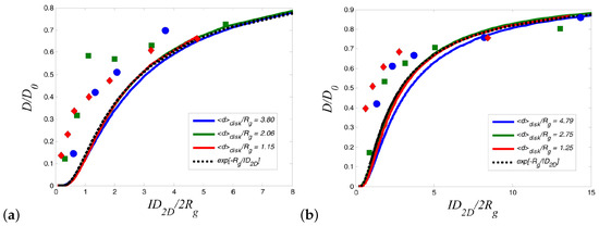 Detailed information regarding the experimental studies of polymer diffusion in nanocomposites can be found in the reviews by Lin et al. [37] and Schneider et al. [63]. In particular, we refer below the main studies regarding polymer diffusion in nanocomposites containing either spherical (such as nanosilica or gold nanospheres) or anisotropic nanoparticles (such as carbon nanotubes or TiO nanorods). The deuterated entangled poly(methyl methacrylate) (PMMA) or PS diffusion was decreased as a function of nanosilica loadings and the normalized diffusion coefficient to the bulk value as a function of the confinement parameter collapses into a master curve (Figure 2). Here, , where is the interparticle spacing, approximates the distance of closest approach for a tracer molecule in the brush and is the tracer radius of gyration. Choi et al. [64] studied the diffusion of deuterated PS in the presence of soft nanoparticles (silica nanoparticles with PS tethered chains) and produced the same curve as that of the hard nanosilicas composites [65,66] where collapsed the reduced polymer diffusion data for isothermal measurements which was considered evidence of a mechanism related to entropy. However, this collapse of breaks down as a function of temperature, and the data does not reduce as well as seen in Figure 2 explaining that mechanism of diffusion is different. In particular, for constant , D is more perturbed from bulk at higher temperatures [67].