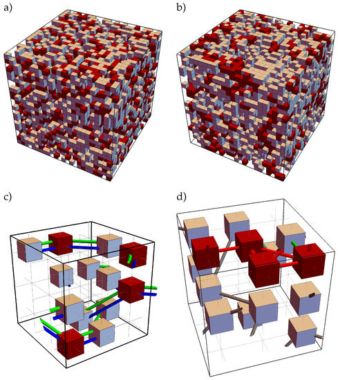 For a typical simulation run, we place N beads, i.e., and beads, randomly on the cubic lattice, where always three beads are arranged as shown in Figure 1b. We choose N as with the volume fraction . This volume fraction represents a dense melt in the bond fluctuation model [20]. An exemplary filled cubic lattice of reduced size is given in Figure 2a and a corresponding cutout of size in Figure 2c.We checked the influence of the system size by performing the simulations for with (lattice notation as Shaffer [21]). We observed no qualitative and quantitative changes of the quantities under investigation.