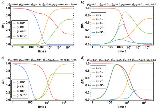 First, we evaluate the influence of the model parameters on the time development of the overall reaction mechanism. With respect to the bond fraction we find a huge variety of time behaviors for the different reaction phases. In Figure 4, the time development of for all bond vector types and the non-bonded reaction centers are given over logarithmic time t for two exemplarily parameter combinations