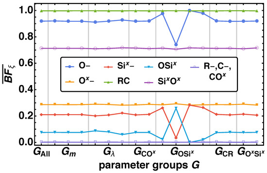 The same behavior is also reflected by the averaged bond fractions over the parameter groups as shown in Figure 6. represents the averaged bond fraction over all parameter combinations. We observe variations of over with from the overall of for O–, Six–, OSix} for two parameter groups and , where the effect of OSix is inverse to O– and Six–. There is a significant variation for , where we can order the parameter groups with decreasing (increasing) order of of O– and Six– (OSix) as , which is also derived from the distributions above. Furthermore, we find the same minor increase (decrease) of for the parameter combinations for O– and Six– (OSix) as from the distributions itself.