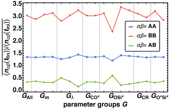 In the next step we investigate the phase separation behavior of the reaction mechanism depending on . Again, for each parameter combination we obtain one value respectively for the mean nearest-neighbor contacts with being the bead type combinations AA, AB, and BB. We determine the averaged mean nearest-neighbor contacts as the arithmetic mean of all values that belong to the parameter combination . In Figure 7 over the parameter groups (see Table 3) are depict. We observe a more complex behavior for than for (compare Figure 6). Again a significant change of for and is found. Additionally, deviations for , , and for BB in major and for ABin minor occurrence can be identified. We find that with increasing m decreasing and the relative number mean nearest-neighbor contacts increases, whereas the effect is inverted for AB. This means that the reduced movability and low network formation reactions hinder the formation of clusters, indicated by a high number of nearest neighbor contact.