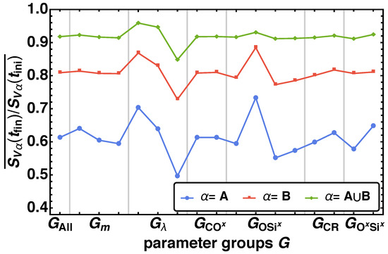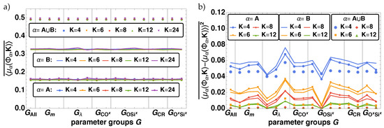 The averaged total fraction of percolating measurement cells with and 1 are given over the parameter groups (see Table 3). The results are shown in (a) for =A∪B, , and , whereas in (b) for A, B} and .