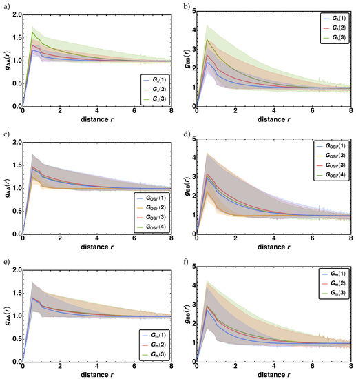 The analysis of the RDF , i.e., per each parameter combination there is one resulting RDF, exhibited that the influence of is neglectable and an increase of leads to a minor increase of and of . The main effects are observed for the parameter groups (a)-b)), (c)-d)), and (e)-f)), as depicted in Figure 9. Here, we present the arithmetic mean RDF of all RDFs per parameter combinations that belong to the (thick colored line), as well as the minimum (lowest thin colored line) and maximum (highest thin colored line) out of the corresponding parameter group . The area between the minimum and the maximum curve is covered by the various parameter combination within each parameter group and colored in the same color. In the left column the results for AA and in the right column for BB are presented. Note, that the corresponding subgroups i of each parameter group are highlighted in different colors. From the plots we find two parameter groups with major variations and one with minor one. The major effects are again observed for and for . With increasing and gets higher and wider by a factor of around 1.5–2 in height and width. For BB additionally we observe that for small values of the maximum is truncated. For a major difference is observed between and with . The distributions for are narrow and spiky with lower maximal values, whereas the distributions of the other three groups are broader with higher values, depending on as well. Note that for the width increases up to a factor of 5, whereas the height increases by factor of 1.5–2. Minor difference is displayed by , where find that with increasing m the RDF primary gets wider (factor around 1.5) and only a minimal increase in height.