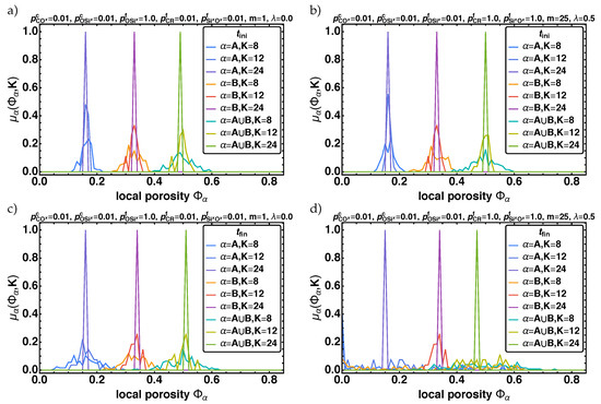 Alternatively to the RDF, the local porosity distribution is used to characterize the pore structure of the material. In Figure 10 the results for the local porosity distributions for A,B,A∪B} are shown exemplary for at in (a,b), and in (c,d) for the two parameter combinations (I) and (II) given in Equations (9) and (10). Analyzing the distributions depending on K, we observe that in all cases the distributions get localized around . This is accepted, as represents the fluctuations of for K and when follows that [31]. Furthermore, we find that the initial distributions for A,B,A∪B} for (I) and (II) are similar in shape independed of the parameters. This reflects the random initialization of the beads on the lattice. However for the distributions are quite different. For (I) the final distributions is more narrow and peaked (see Figure 10c), whereas for (II) they get wider and flatter (see Figure 10d). As the changing width is an important feature of these distributions we will also analyze the variance of the local porosity distributions, next to their mean values (Figure 11).