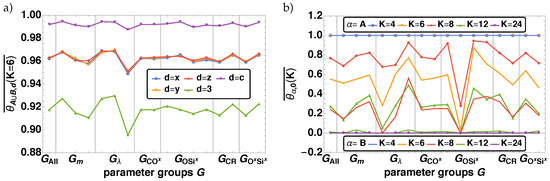 Finally, we investigate the total fraction of percolating measurement cells along different directions d given in Table 2 for different cell sizes K. We find that the obtained structures are fully percolating or not at all in nearly all cases, i.e., for and 0 for . There are two exceptions: A∪B and at small and A, B} and . These two cases are shown in Figure 12a,b. As the effects for are similar, but the magnitude of the effect for is larger, we present here only the results for .
