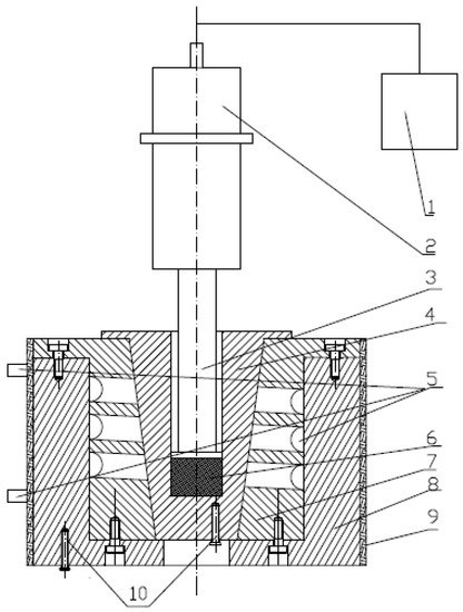 Scheme of the special ultrasound applicator. 1: Ultrasonic generator; 2: Piezoelectric transducer; 3: Probe; 4: Cell; 5: Cooling system; 6: Melt; 7, 8: Mold cavity; 9: Electric heater; and 10: Thermocouples.