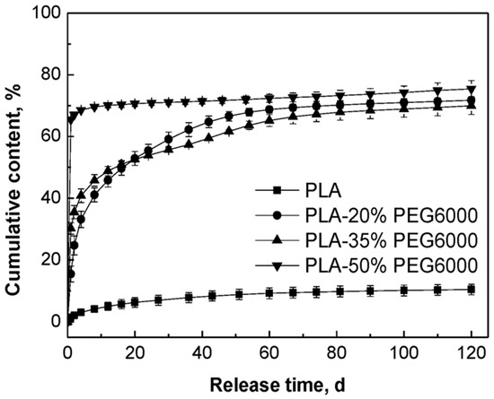 With the increase of the content of PEG, the initial release rate of MB increased. The release rates of MB from the tablets to which 20% PEG and 35% PEG were added were lower than that of the tablets with 50% PEG and decreased slowly in the first 60 days. In the first two days, the tablets to which 50% PEG were added showed the highest release rate of MB and then the release rate decreased sharply since 70% of the MB had been released. These different release behaviors could be attributed to the different compositions of the polymer matrices. In the cases of PLA and its blends with PEG, since PEG is a hydrophilic and non-toxic biomaterial which has been usually used to improve the hydrophilicity of aliphatic polyesters, it was known that the hydrophilicity of the polymer matrix decreased in the order of PLA/PEG (50/50) > PLA/PEG (65/35) > PLA/PEG (80/20) > PLA [50,51]. Simultaneously, the degradation rate of the polymer matrix decreased in the same order. Therefore, with better hydrophilicity and faster degradation rate of the polymer matrix, the release rate of MB was fastest for the PLA/PEG 50/50 blend.