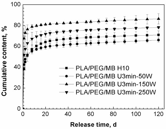 Effect of ultrasound on the release behavior of MB from PLA/PEG (65/35) blends immersed in PBS for 120 days (PLA/PEG/MB H10: without ultrasound treatment, PLA/PEG/MB U3min-50W: treated by 50 W ultrasound for 3 min, PLA/PEG/MB U3 min-150 W: treated by 150 W ultrasound for 3 min, PLA/PEG/MB U3min-250W: treated by 250 W ultrasound for 3 min).