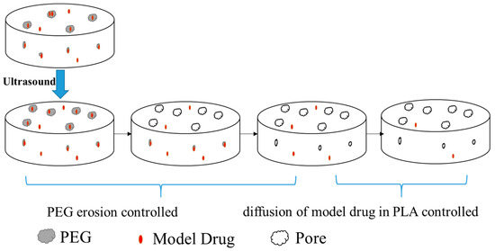 By blending PEG with PLA, without ultrasound or heat treatment, the release of MB from PLA/PEG was ascribed to not only the erosion of PEG, but also the diffusion of MB from PLA. So the release of MB from PLA/PEG could be divided into two steps: at the beginning of the release, the release rate of MB through the erosion of PEG was higher than that through the diffusion from the PLA phase, so the first stage was an erosion controlled stage; after several days release, most of the PEG was dissolved in the medium and a lot of pores were left in the tablet and the release of MB was controlled by its diffusion from the porous PLA matrix, so the second stage was diffusion controlled.