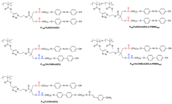 - Yu, H. Photoresponsive liquid crystalline block copolymers: From photonics to nanotechnology. Prog. Polym. Sci. 2014, 39, 781–815. [Google Scholar] [CrossRef]
