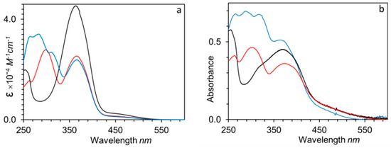 UV–Vis spectra in THF solution (a) and thin film (b) of P100(7eAZO/eAZO) (black lines), P100(10cCNB/eAZO) (red lines) and P70(7cCIN/eAZO) (blue lines).