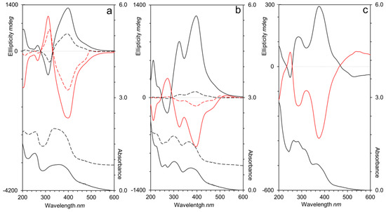 UV–Vis and electronic circular dichroism spectra of (a) P100(7eAZO/eAZO) and P40(7eAZO/eAZO)-b-PMMA800, (b) P100(10cCNB/eAZO) and P40(10cCNB/eAZO)-b-PMMA800, and (c) P70(7cCIN/eAZO) after irradiation with right (black) or left (red) handed CPL. Spectra of the homopolymers are displayed in solid lines and block copolymers in dotted lines.