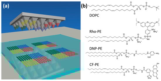Scheme of polymer pen lithography (PPL) and the phospholipids used in the present study. (a) A polymer stamp featuring pyramidal pens is inked with different phospholipids in distinct segments and then used for printing of multiplexed lipid arrays. (b) The chemical structure and abbreviated names for the different phospholipids used in the printing experiments.
