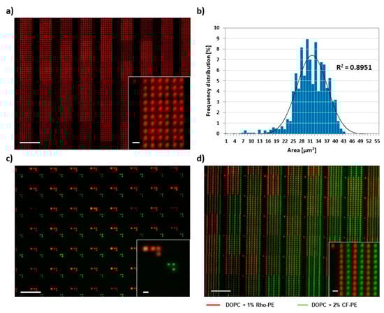 PPL-printed phospholipid arrays. (a) Representative fluorescence micrograph of a 6 × 10 spot array of a 1,2-dioleoyl-sn-glycero-3-phosphocholine (DOPC)/Rho-PE mixture printed on glass; (b) Histogram of the area distribution of 30 lipid arrays as seen in (a); (c) Example for arbitrary patterning with two inks. Printed inks were DOPC admixed with either 1 mol% Rho-PE (red channel) or 2 mol% CF-PE (green channel). Details on the alignment challenge and offset correction in two-color printing are shown in Figure S3; (d) Example of a multiplexed phospholipid array (same inks as in (c). The obtained two-color substrate was further analyzed by measuring the distances between spots within and among the different ink patterns. As shown in Figure S4, the measured distances are in accordance to the theoretical values, confirming the success of alignment and printing procedure. The scale bars in all panels equal 100 µm in the main image and 10 µm in the insets.
