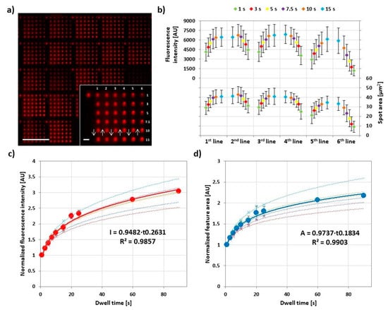 To assess the dwell time influence, 6 × 6 feature arrays were printed, while increasing and decreasing dwell time per feature in each column to simultaneously check for hysteresis effects. After printing, for each experiment, 30 arrays were analyzed by fluorescence microscopy. All the prints were performed at 40% RH and room temperature. Lateral feature area was directly measured, while fluorescence intensity was plotted additionally as proxy for feature height []. The plot of the feature area and fluorescence intensity averaged for 30 different arrays over the course of an array print (Figure 3b) shows that both parameters rise and fall repeatedly for the first four lines of the print, before ink depletion effect leads to lower intensity and area. At the same time, it becomes clear that overall intensity and area are not extensively depending on dwell time as the intrinsic variance between arrays printed by different tips (expressed in the error bar range) has almost the same influence on overall intensity. The reproducibility of the printed substrates was also proofed by comparing the average areas and intensities among the six independent experiments (Figure S6). The normalized and combined data from the experiments (Figure 3c,d) reveal a common trend for feature area and intensity. Both are growing with dwell time but level off more and more for longer dwell times.