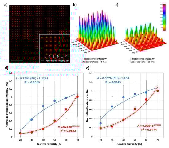 Influence of relative humidity in lipid ink transfer. (a) Representative fluorescence micrograph of 6 × 6 spot arrays printed to analyze the amount of transferred lipid in dependence of relative humidity during printing. Dwell time was 1 s for all features. The inset shows higher magnification of a single array along with the printing scheme. The scale bars equal 100 µm in the main image and 10 µm in the inset; (b,c) Three-dimensional plots of the intensity profile of a single array from two independent experiments; (d,e) Plots of the average normalized intensity and area of spots against relative humidity for a stamp carrying high ink load (blue) and low ink load (red). Data were normalized on the 70% RH data point to compare the trends from three independent experiments. The analyzed images can be found in Figure S7, along with data before normalization. For each slide, 30 arrays were analyzed. Error bars represent standard deviation.