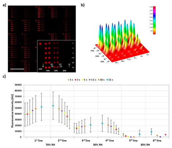 Combined effect of dwell time and humidity on lipid ink transfer. (a) Representative fluorescence micrograph of the printed 6 × 6 arrays designed to analyze the amount of transferred lipid in dependence of relative humidity and dwell time. The inset shows higher magnification of a single array along with the printing scheme. The scale bars equal 100 µm in the main image and 10 µm in the inset; (b) Three-dimensional plot of the intensity profile of the single array from the inset in panel (a); (c) Plot of the average intensity of corresponding spots (same line, same RH and same dwell time) in 30 analyzed arrays against the dwell time and grouped by RH. Error bars represent standard deviation.