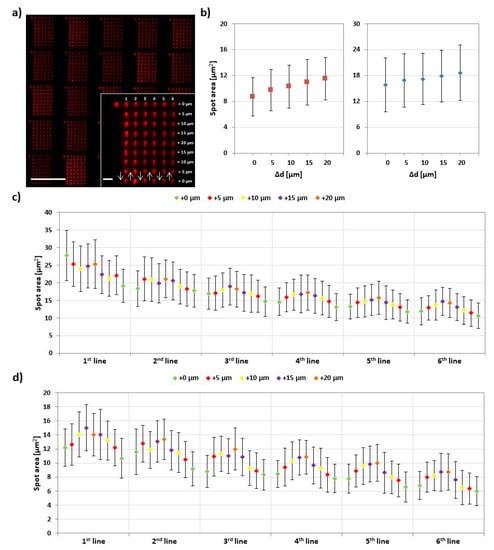 Effect of printing pressure on lipid ink transfer. (a) Representative fluorescence micrograph of the printed 9 × 6 arrays designed to analyze the amount of transferred lipid in dependence of relative pressure increase Δd (i.e., increase in stage advancement (d). The inset shows higher magnification of a single array along with the printing scheme. The scale bars equal 100 µm in the main image and 10 µm in the inset; (b) Plot of the average area against Δd in two independent experiments. Equivalent plots for the average fluorescence intensities against Δd in the two experiments are shown in Figure S8; (c,d) Plots of average area of corresponding spots (same line and same Δd) against Δd in 30 analyzed arrays in the two experiments. Error bars represent standard deviation.