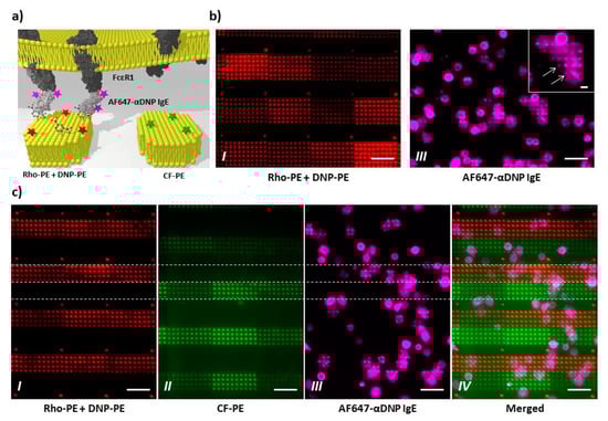 Specific antibody binding on antigen-containing lipid arrays. (a) Schematic outline of the performed experiments. The presented antigens were specifically stained by Alexa Fluor® 647 (AF647)-labeled anti-dinitrophenol (DNP) IgE antibodies, followed by incubation with an AF647-labeled secondary antibody. AF647 signal from the labeled antibodies is expected in co-localization with spots containing DNP-conjugated lipids (DNP-PE, left part of scheme), while no signal should be present in absence of DNP-PE (right); (b) One-color experiments: 6 × 10 spot arrays containing DOPC (as carrier lipid), dotted with 1% Rho-PE and with 10% DNP-conjugated lipid (DNP-PE), were printed; (c) Two-color experiments: Two adjacent 4 × 10 spot arrays were printed with two different inks. The first contains DOPC (as carrier lipid), 1% Rho-PE, and with 10% DNP-conjugated lipid (DNP-PE), while the second contains DOPC and 2% Carboxyfluorescein-conjugated lipids (CF-PE). The results confirm accessibility and specific recognition of the presented antigens, since AF647 signal (panel III) is detected in co-localization with DNP-containing arrays (panel I) and absent on negative control arrays (panel II). Note that the number of columns and rows in the arrays appear inverted, since the images were clockwise rotated for a clearer results interpretation of two-color experiments. In addition, the images in Figure S9 ensure no crosstalk between the fluorescence channels, confirming that the detected AF647 signal uniquely rises from bound antibodies. All scale bars equal 50 µm.
