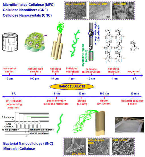 Hierarchical structure of cellulose: top image: plant cellulose; bottom image: bacterial cellulose. Adapted with permission from ref. [5]. Copyright 2014, Elsevier.