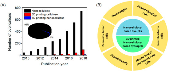(A) Illustration of the annual number of scientific publications using the search terms “Nanocellulose”, “3D printing cellulose”, and “3D printing nanocellulose”. Data analysis was completed using Scopus search system on 28 March 2019. (B) Different types of cell lines demonstrated for viability and proliferation on 3D bioprinted nanocellulose-based hydrogels.
