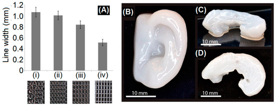 (A) Line width measurements of 3D-printed large grids with alginate inks: (i) 2% alginate, (ii) 3% alginate, and (iii) 4% alginate, compared to (iv) Ink9010 (2.25% CNFs + 0.25% alginate). The photos below the graph show the printed grids and their different line resolutions. Small grid printed with (B) 3D printed human ear and (C,D) sheep meniscus with Ink8020 (2% CNFs + 0.5% alginate). (C) Side view and (D) top view of the sheep meniscus. Adapted with permission from ref. [33]. Copyright 2015, American Chemical Society.