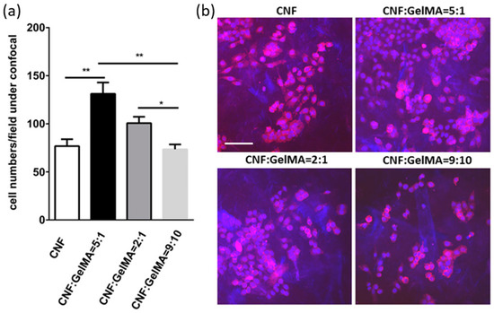 Mouse fibroblast cells were incubated with the indicated 3D matrix in a density of 1 × 105 cells per well. (a) The cell proliferation and (b) representative confocal images were measured after 3 days of incubation. Scale bar, 50 μm. Bar = mean ± SD; n = 4. * = p < 0.1; ** = p < 0.01. Matrix hydrogels presenting inks of CNF and CNF/GelMA with weight compositional ratios of 5:1, 2:1, and 9:10. Adapted with permission from ref. [42]. Copyright 2019, American Chemical Society.