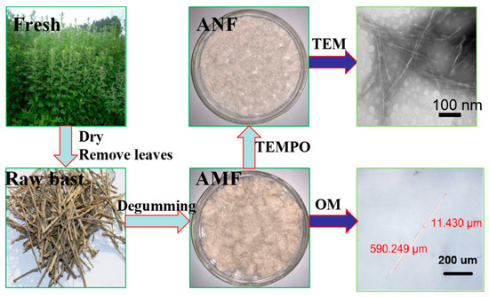 Figure 1. briefly introduces the experimental route of this research. The fresh Artemisia vulgaris plant straw is dried and the bast is taken out. The micron-sized fiber (AMF) is prepared by degumming with alkali, and the nano-sized fiber (ANF) is prepared by oxidation of TEMPO. In order to understand the size information of products, TEM and OM characterization tests were performed on AMF and ANF.